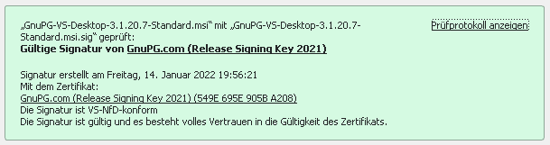 Das Ergebnis der Prüfung mit einer bereits installierten Version von GnuPG (VS)-Desktopp® oder Gpg4win sollte so aussehen:
