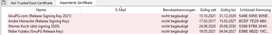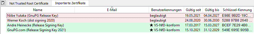In der Regel reicht es, wenn Sie den GnuPG.com-Schlüssel beglaubigen, da dieser normalerweise für die Signatur verwendet wird. Jedoch kann aus betrieblichen Gründen gelegentlich ein anderer Schlüssel zum Einsatz kommen – keine Sorge, alle diese Schlüssel besitzen dieselbe Gültigkeit. Nach der Beglaubigung sollte die Liste der importierten Zertifikate in Kleopatra so aussehen: